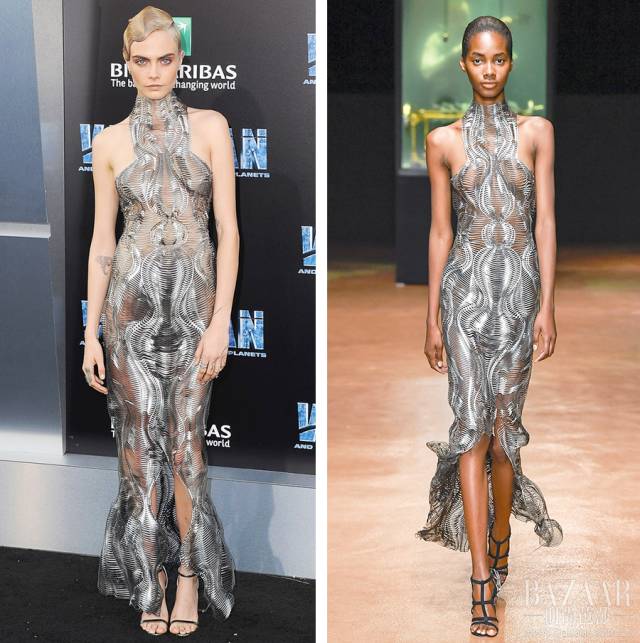 Cara Delevingne 一袭Iris Van Herpen 2017秋冬高定长裙大秀好身材,银色透视加上高领露肩的设计未来摩登感也太强了!